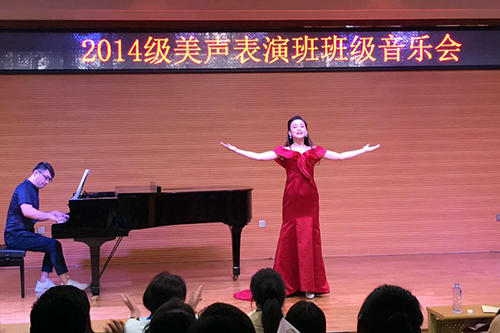 2017年5月9日晚7点,在我校小音乐厅迎来了音乐学院2014级美声表演班班级音乐会。音乐会由一首男声表演唱印度尼西亚民歌《哎呦,妈妈》拉开帷幕。幽默风趣的表演赢得了在场老师同学们的热烈掌声。此次音乐会同学们分别以独唱和重唱的形式演绎了中文、意大利语、蒙语、德语、俄语、法语、捷克语等多种风格的中外艺术歌曲和咏叹调。